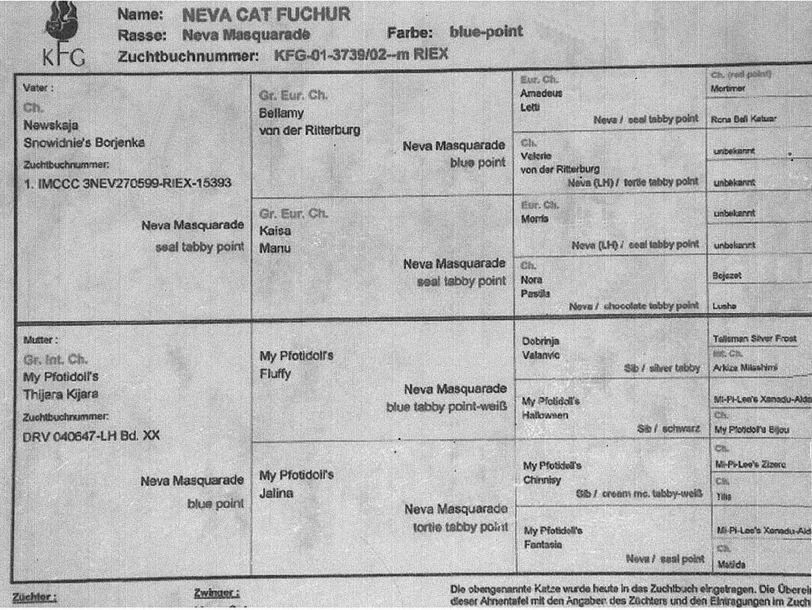 da in der Database auf www.pawpeds.com leider die Stammbaumdaten geändert wurden, da es einigen peinlich war, dass auch chocolate in diesem Stammbaum zu finden ist, hier der Orginalstammbaum von Neva Cat Fuchur:
