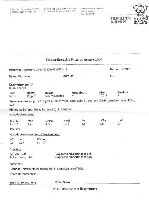 Gesundheitsinformation: PRA-DNA-Testergebnis der Vorfahren im cinnamon-Zuchtprogramm : NN = negativ auf diese Mutation PK-Mangel-DNA-Testergebnis der Vorfahren: NN = negativ auf diese Mutation