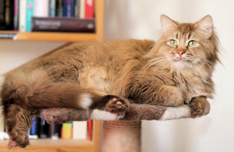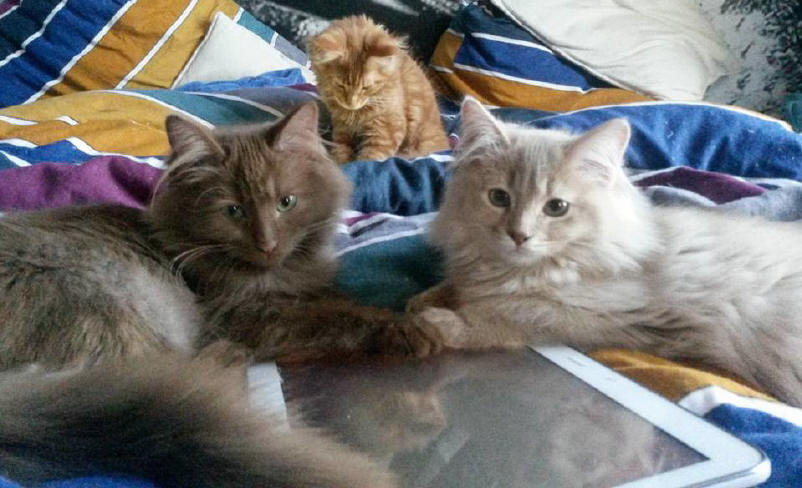 fawn-torbie-ticked rechts im Bild zusammen mit ihrer Sibi-Freundin Hazel und ihrem Maine Coon Kumpel
